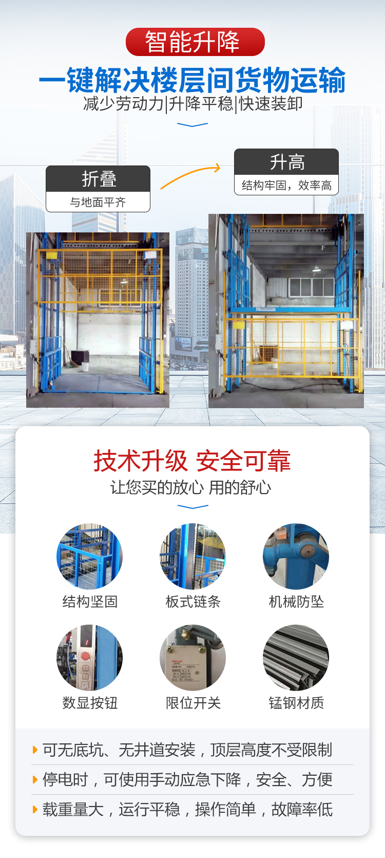 產(chǎn)品結構堅固,承載量大,升降平穩,故障率低,是經(jīng)濟實(shí)用的低樓層間替代電梯的理想貨物輸送設備。