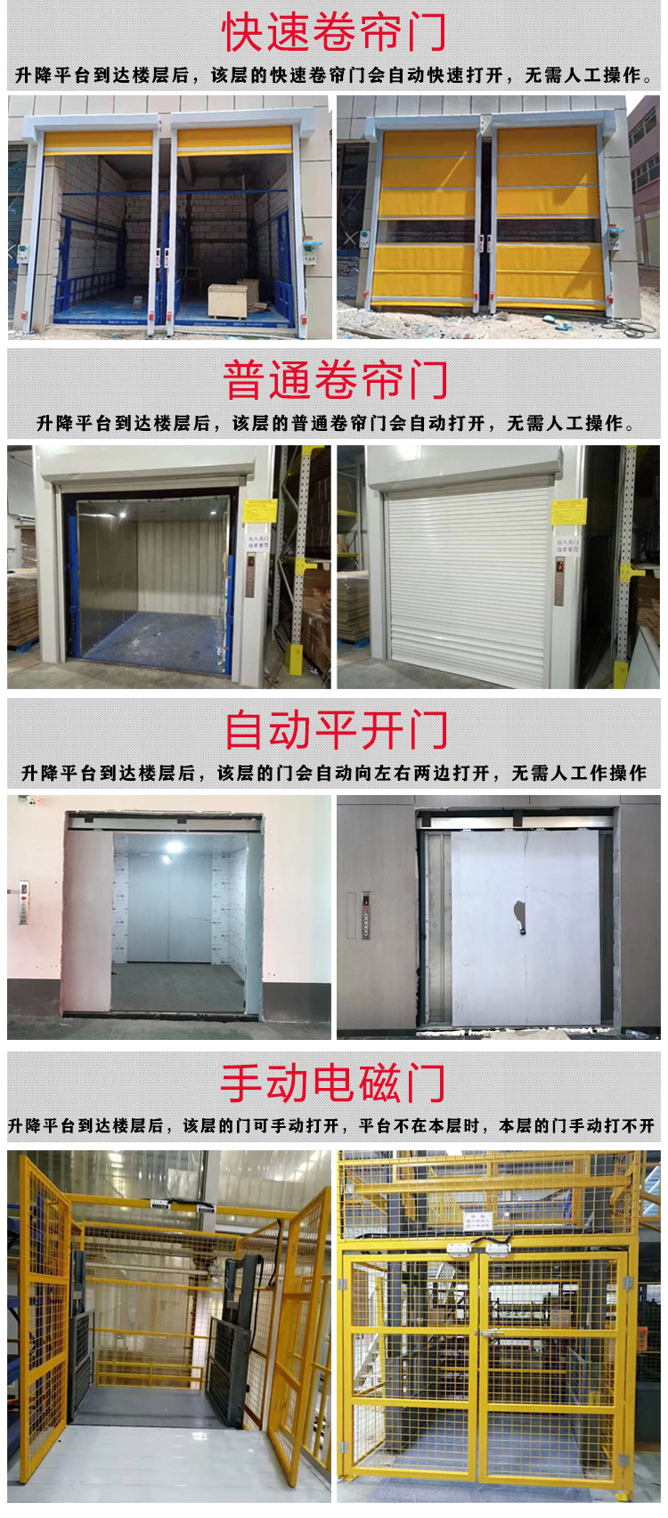 液壓升降貨梯設定防墜、上下層門(mén)互動(dòng),各樓層都安裝數字顯示操作按鍵。層門(mén)可全線(xiàn)貫通,工業(yè)廠(chǎng)房?jì)韧饪苫ハ啻灵_(kāi),便捷、節約室內空間,層門(mén)的選擇有多樣性。根據客戶(hù)的預算和實(shí)用需求選擇適合的層門(mén)即可。